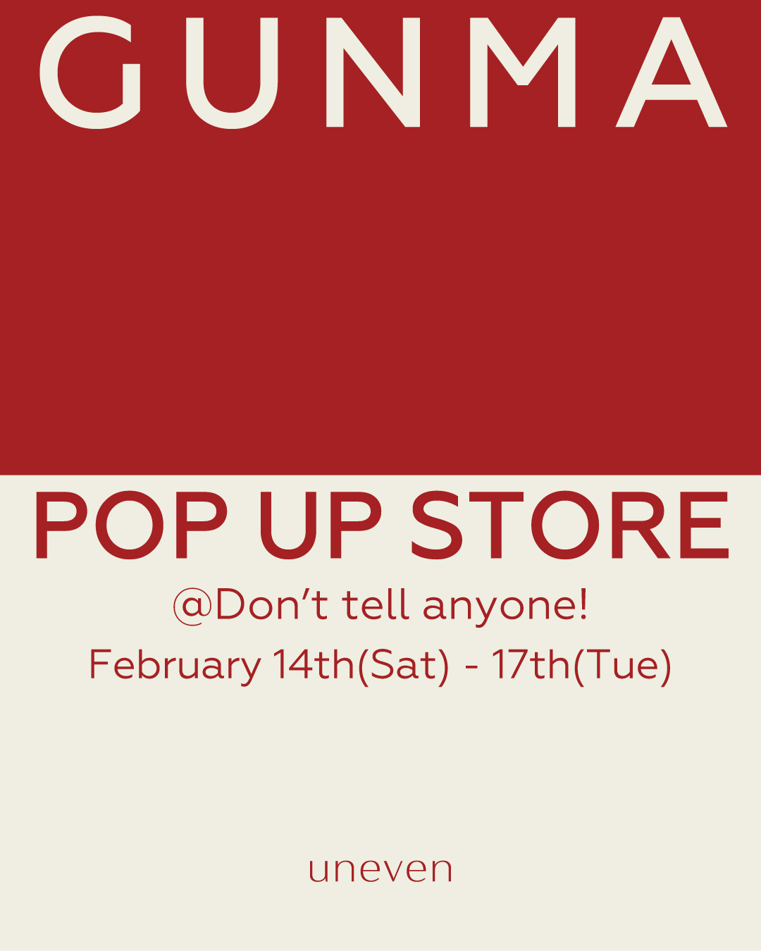 2月14日(土)から2月17日(火)まで群馬県伊勢崎市にある「Don’t tell anyone!」にてuneven POPUP SHOPを開催いたします。