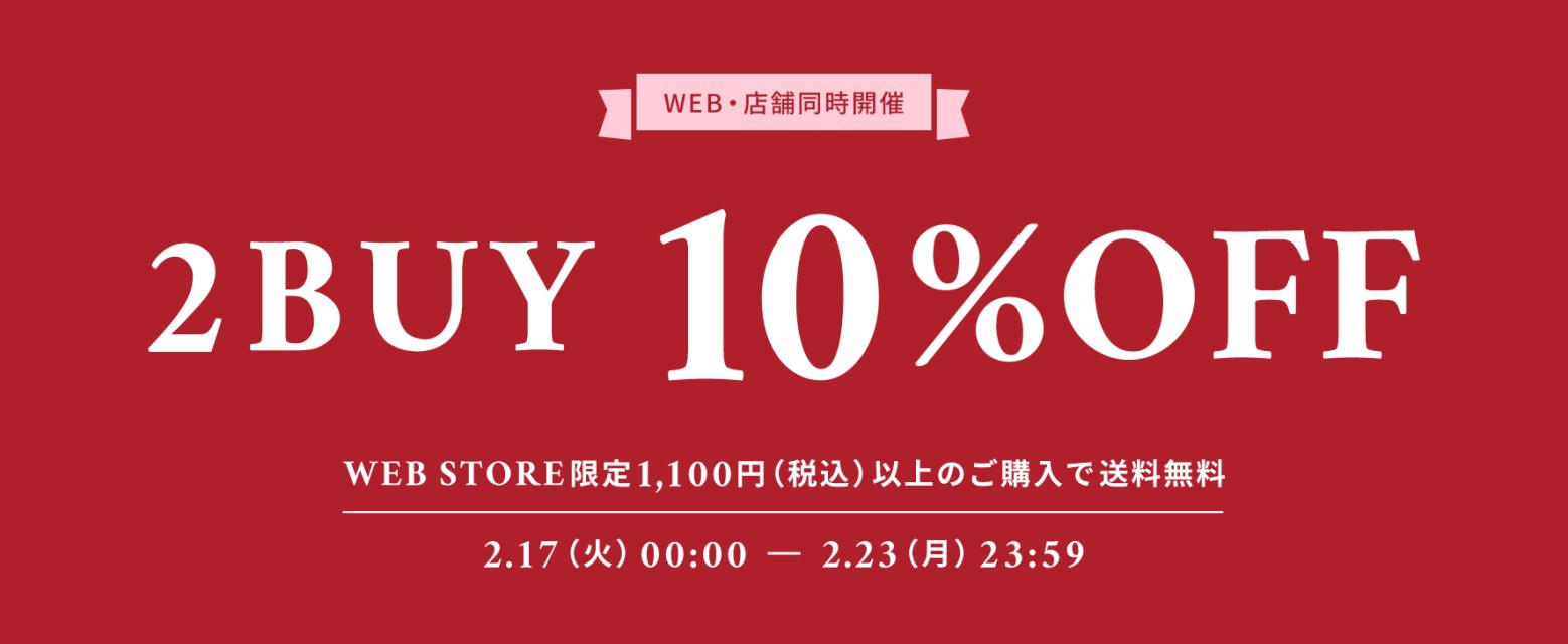 2/17(火)~2/23(月・祝)の7日間、対象のWEB STOREおよび店舗にて、2点以上のお買い物で10%OFFに!